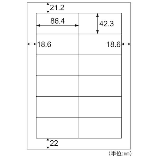 【商品説明】●いろいろなプリンタで使用できるラベルです。しっかり貼れてキレイにはがせる再剥離タイプです。●レーザ・インクジェット・コピー対応●入数:100●用紙サイズ:A4(210×297mm)●ラベルサイズ:86.4×42.3mm●面付:12 面●厚さ:0.19mm●ラベルのみの厚さ:0.10mm●坪量:179 g/m2●素材:上質紙 ※剥離紙はリサイクル可能です。
