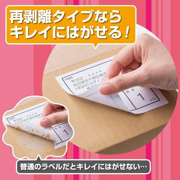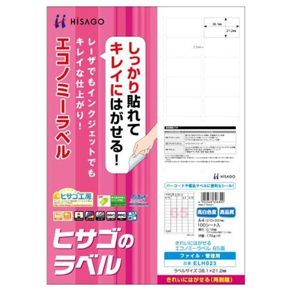 【商品説明】●いろいろなプリンタで使用できるラベルです。しっかり貼れてキレイにはがせる再剥離タイプです。●レーザ・インクジェット・コピー対応●入数:100●用紙サイズ:A4(210×297mm)●ラベルサイズ:38.1×21.2mm●面付:65 面●厚さ:0.19mm●ラベルのみの厚さ:0.10mm●坪量:179 g/m2●素材:上質紙 ※剥離紙はリサイクル可能です。