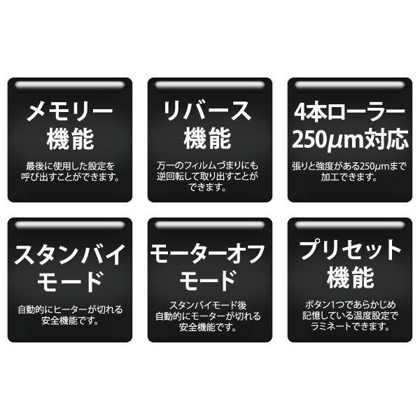 【商品説明】●最大ラミネート幅:335mm(A3)●最大ラミネート厚:0.8mm(用紙厚も含む)●ラミネート速度:530mm/分(50Hz) 636mm/分(60Hz)●対応フィルム:100~250μm(片面厚)●温度調節範囲:100~160℃●ウォームアップタイム:約5~10分●加熱方式/ローラー本数:内部加熱方式/4本ローラー●電源電圧/消費電力:AC100V(50・60Hz)/840W●本体サイズ/重量:592×210×123m