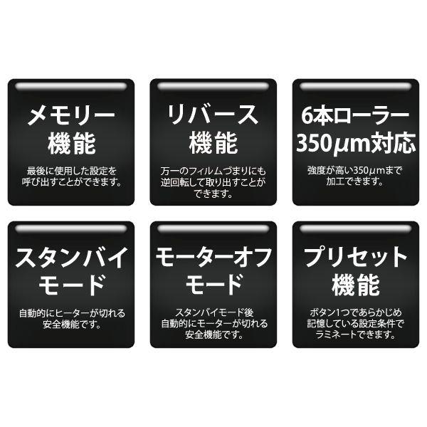 【商品説明】●最大ラミネート幅:335mm(A3)●最大ラミネート厚:1mm(用紙厚も含む)●ラミネート速度:400~1800mm/分●対応フィルム:100~350μm(片面厚)●温度調節範囲:常温、40~160℃●ウォームアップタイム:約3分●加熱方式/ローラー本数:外部加熱方式/6本ローラー●電源電圧/消費電力:AC100V(50・60Hz)/1200W●本体サイズ/重量:530×305×155mm/17.2kg●付属品: