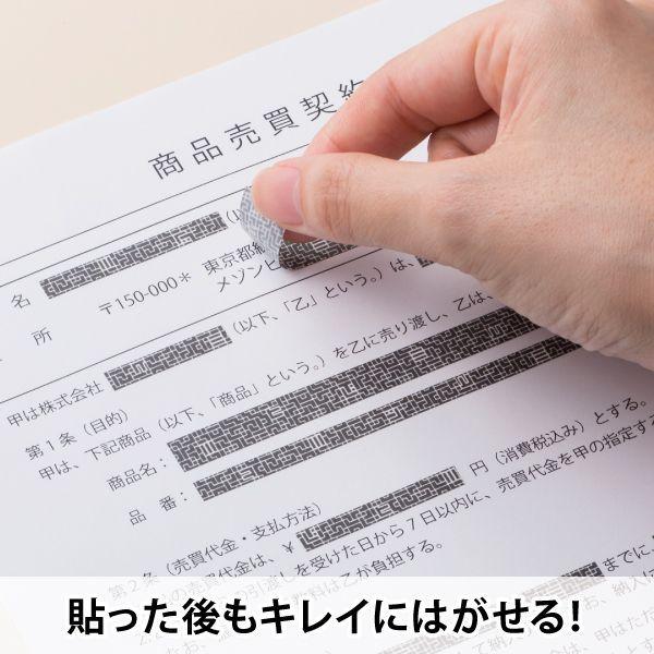 【商品説明】●原本を汚さず、隠したい部分に貼って、後からキレイにはがせる再剥離タイプの目隠しテープです。書類の部分的な目隠しに!コピー・FAX時の一時的な目隠しにも使用できます。地紋タイプと黒タイプそれぞれ3種類の幅をご用意しています。●入数:1●※インクジェットプリンタ専用紙にはご使用いただけません。※テープはゆっくり引き出してお使いください。※被着面の素材によっては、テープを貼り付けた後、はがす際に被着面の印刷がはがれてしまうことがありま