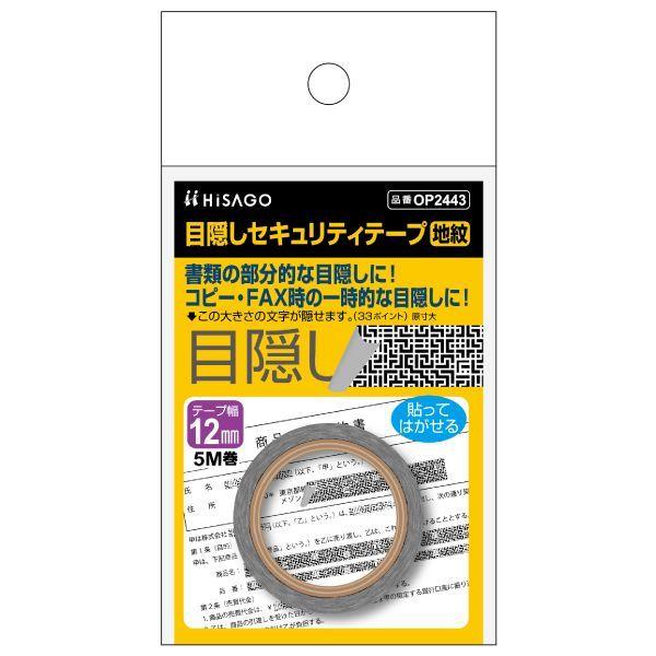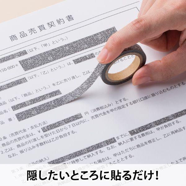 【商品説明】●原本を汚さず、隠したい部分に貼って、後からキレイにはがせる再剥離タイプの目隠しテープです。書類の部分的な目隠しに!コピー・FAX時の一時的な目隠しにも使用できます。地紋タイプと黒タイプそれぞれ3種類の幅をご用意しています。●入数:1●※インクジェットプリンタ専用紙にはご使用いただけません。※テープはゆっくり引き出してお使いください。※被着面の素材によっては、テープを貼り付けた後、はがす際に被着面の印刷がはがれてしまうことがありま
