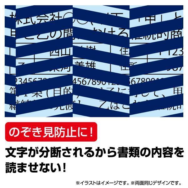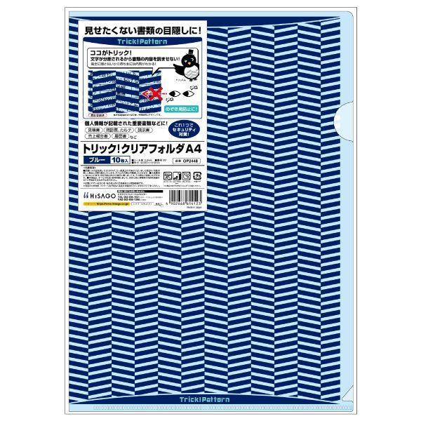 【商品説明】●中に入れた書類の文字が見えにくくなる、特殊なパターン入りのクリアフォルダです。契約書や個人情報など、内容を見られたくない書類の保管・持ち運びに便利です。ブラック・ブルー・ピンクのカラーバリエーションで分類もしやすいです。●入数:10●※本製品は、すべての状況・使用形態において、完全に個人情報等の内容の保護、盗み見・改ざん・漏洩の防止を保証するものではありません。●サイズ:A4(外寸W220×H310mm)●厚さ:0.2mm●素材:PP●