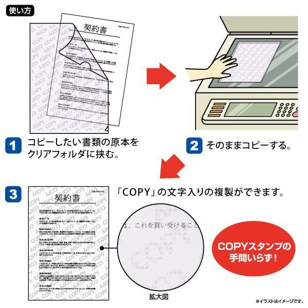 【商品説明】●書類を挟んでコピーすると、「COPY」の文字入りの複製ができるフォルダです。COPYスタンプを押す手間が省け、原本を汚さずに原本とコピーが判別できます。●入数:1●※本製品は、お使いになるコピー機の状態によっては、正常な効果が得られない場合もあります。●用紙サイズ:A4(外寸W220×H310mm)●厚さ:0.2mm●素材:PP