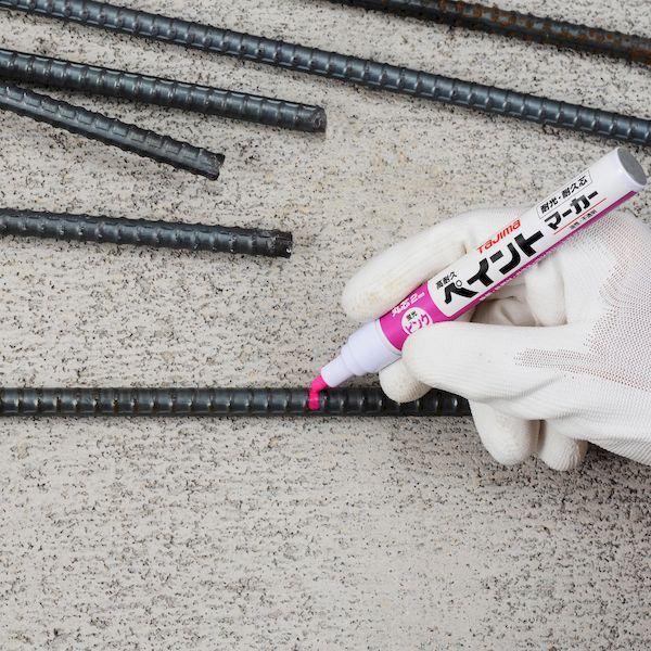 (株)TJMデザインメーカーお問い合わせ:0120-125577【商品説明】●高い隠ぺい力と耐光性に優れた油性特殊インクを採用。●黒っぽい建材と薄暗い現場でくっきりとした指示線が描けます。筆記線は紫外線にも退色しにくく、長期にわたって発色を損ないません。さらに金・銀色、蛍光2 色もラインナップし誘目性を高めました。●芯は線幅2mmの丸芯で先端はアール形の<中字>です。高耐久芯を採用し鉄筋やコンクリートなどの固く荒い部材対象物にマーキングできます。●インク色は黒・赤・白・青・蛍光黄・蛍光ピンク、金、銀の計8色。紫外線に退色しにくい工業用インクを採用しました。鉄筋、鉄鋼材、ガラス、コンクリートなど概ね全ての建材・部材への筆記に適性があります。形状は長さ141mm、直径15mm(キャップ時)、重量18g(金、銀17g)。 ●仕様●芯の太さ:中字2mm●芯先:丸芯●油性:キシレン