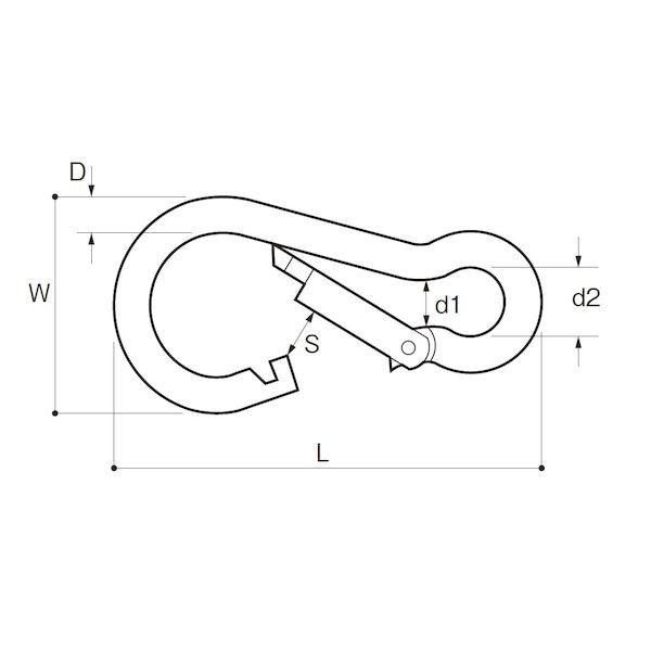 ふじわらアイオウルメーカーお問い合わせ:06-6976-3201【商品説明】●特徴:チェーンの端末金具などに、ワンタッチで付け外しが可能な、一番ポピュラーなフックです。ステンレス製でサビに強いカラビナフックです。●用途:チェーン・ワイヤー・ロープなどの連結金具に最適●材質:SUS304ステンレス●質量(g):9●D(mm):4●L(mm):45●W(mm):22●S(mm):7●d1(mm):4.5●d2(mm):6.5●使用荷重(kg):30鎖 連結金具 連結部材 チェーンパーツ チェーンポール チェーンスタンド ポール 駐車場 パーキング 金具 金物