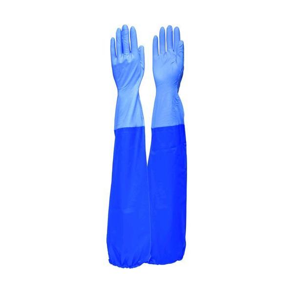 【特長】●独自の技術(特許登録済)により腕カバーを強力に接着しています。【用途】●食品加工・機械工作・清掃・農業・漁業・林業【仕様】●色:ブルー●サイズ:L●厚さ(mm):0.35(手袋部)、0.16(カバー部)●全長(cm):65.0●手のひら周り(cm):22.5●中指長さ(cm):8.4●食品衛生法:適合【仕様2】●腕カバー付●食品衛生法適合品●裏毛なし【材質/仕上】●手袋部:表:合成ゴム(ニトリルゴム)、裏:植毛なし●腕カバー部:ポリエチレン系樹脂【原産国】ベトナム
