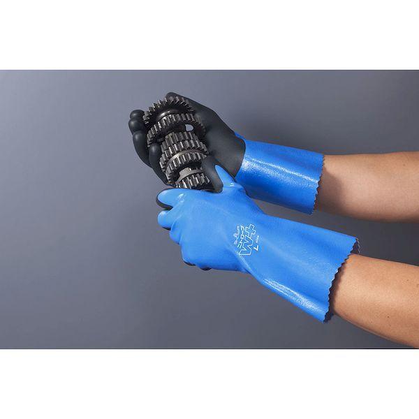 ショーワグローブメーカーお問い合わせ:0120-641-245【特長】●ニトリルゴムをコーティングしているため、油に強く、摩耗強度にも優れています。●ダブルコーティングによる耐油性・防水性に加え、すべり止め層グリップ力にも優れます。●シームレス構造のため、手袋の中で縫い目が当たらず作業中の痛み・不快感を軽減します。●独自の手型を採用し、手袋が指先・手のひらにフィットします。【用途】●水産業、水産加工業、機械工業、清掃【仕様】●色:ブルー●サイズ:L●厚さ(mm):約1.4●全長(cm):29.0●手のひら周り(cm):22.5●中指長さ(cm):8.0●すべり止め:あり●タイプ:オールコート【仕様2】●裏布付●18ゲージ編【材質/仕上】●繊維部:ポリエステル●すべり止め部:ニトリルゴム【原産国】ベトナム