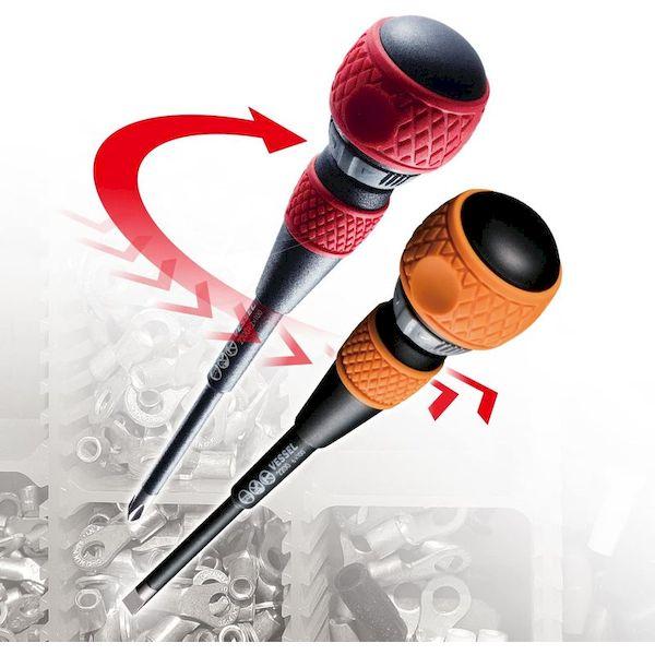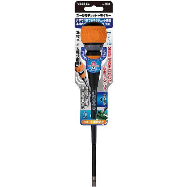 ベッセルメーカーお問い合わせ:0120-999-914【特長】●ボールグリップドライバーにラチェット機構を搭載しました。●コンセント等の速結端子に使えるマイナス刃先です。●片手で高速締付ができ、持ち替えの手間がなく、高所での作業に最適です。●軸部のみ取外して交換できます。(替え軸 No.2200B)●ラチェット部分は金属部が露出しない安全構造で、金属を通じた感電を防止します。●ショート事故を防止する軸カバー付きです。スリムな軸径なので端子台での作業に最適です。【用途】●端子台工事・電気工事・電信電話・空調工事・リフォーム等に。【仕様】●刃先:[[-]]6●全長(mm):250●軸長(mm):150【仕様2】●先端:マグネット入り●全身焼入●ショート事故防止カバー付き。【材質/仕上】●軸:ビット材●グリップ:樹脂【注意】●正しい用途・サイズ・使い方を確かめてご使用ください。●電気作業ではショート・感電にご注意ください。【原産国】日本