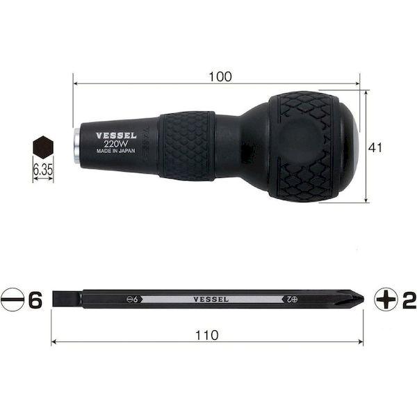 ベッセルメーカーお問い合わせ:0120-999-914【特長】●電動ドライバー用ビット(対辺6.35mm)を差し込んで、ハンドドライバーとして使用できる”ボールグリップ ビット差替えグリップ”と、両頭ビットのセットです。●グリップは使い慣れたボールグリップです。●コンセント等の速結端子に使える[[-]]刃先と、使用頻度の高い[[+]]2を組み込んだ2サイズ対応のビットをセットしました。【用途】●電気工具・家具の組立・メンテナンス・車載などに。【仕様】●刃先:[[+]]2、[[-]]6●軸長(mm):110●ビット長さ(mm):110●グリップ径(mm):41●ビット差込口(mm):対辺6.35【仕様2】●先端:マグネット入り【材質/仕上】●グリップ:ポリプロピレン、エラストマー●ビット:工業用特殊合金鋼【注意】●クッションリングがついたビットは使用できません。●全長40mm以下のビットは使用できません。【原産国】日本