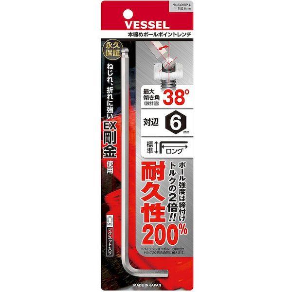 ベッセルメーカーお問い合わせ:0120-999-914【特長】●奥深い場所に最適なロングタイプです。●ねじれ、折れに強いEX剛金を使用しています。●傾き角度は最大38°(設計値)です。●レンチを傾けると駆動する位置が六角穴の入り口付近に移動するため、首部が太くても傾き角度が最大38°得られます。●ネジを緩めるときに障害物に接触しても、レンチが抜けやすい設計になっています。●ボール部が六角穴にはまり込んで抜けなくなることがありません。●永久保証付きです。(過度な使用方法による破損や変形、摩耗や消耗は適用外です。)●六角穴付ボルトの保持が可能です。【用途】●各種金型、工作機械類、ロボット、自動機、自動車、二輪車整備などの各種組み立て、メンテナンスに。【仕様】●対辺寸法(mm):6●首下寸法(mm):32●全長(mm):186【仕様2】●EX剛金●傾き角度38°●全身熱処理●マグネット入り【材質/仕上】●軸:ビット材【注意】●正しい用途・サイズ・使い方を確かめてご使用ください。●家庭ではお子様に注意して保管してください。●予告なく、仕様、サイズを変更することがあります。【原産国】日本