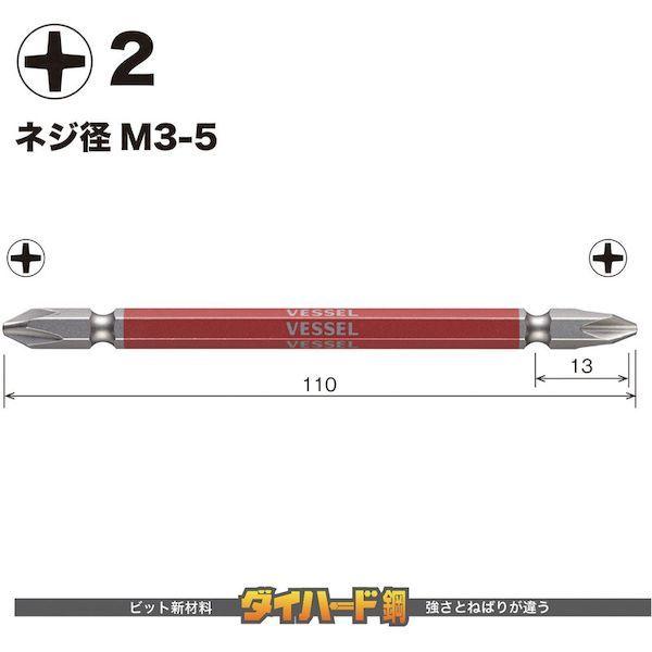 ベッセルメーカーお問い合わせ:0120-999-914【特長】●六角面すべてにカラー印刷をしており、塗装品のようなにじみがなくシャープなエッジです。(全長200/300/500mmを除く)●10色カラーでサイズを色分けし、ビットが選びやすくなっています。●ビット材はダイハード鋼(最高硬度HRC62)を使用しています。●強くてしなやかなで耐久性は抜群です。●精緻な刃先加工で高い嵌合性を実現しました。●刃先部分にはメッキや塗装がつかないためネジとの食いつきが良く、様々なネジにフィットします。【用途】●建築、電気、機械組立・整備、精密組立、DIYに。【仕様】●刃先:[[+]]2●全長(mm):110●色:赤●セット内容(本):2●シャンク径(mm):6.35●パック入数(本):2【仕様2】●ダイハード鋼●マグネット入り●18V対応●差込軸(mm):6.35●軸色:黄●両頭●先端:マグネット入り●18Vインパクト対応【材質/仕上】●ダイハード鋼(最高硬度HRC62)【注意】●作業時は、保護メガネを着用してください。●必要以上に無理な力で使用しないでください。●工具は、本来の使用目的以外で使用しないでください。●電流が流れているものには使用しないでください。●正しい用途・サイズ・使い方を確かめてご使用ください。【原産国】日本