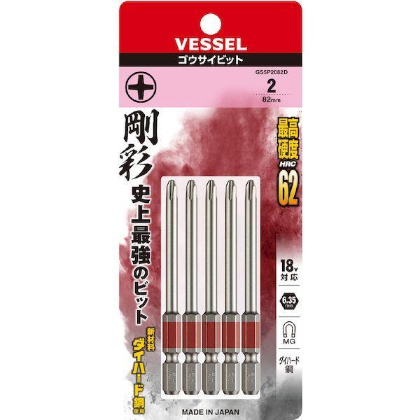 ベッセルメーカーお問い合わせ:0120-999-914【特長】●剛彩ビット用に開発した印刷機により六角面すべてにカラー印刷、塗装品のようなにじみがなくシャープなエッジで、VESSELロゴもクリアに表示されています。●カラーでサイズを色分けし、ビットが選びやすくなっています。●ビット材はダイハード鋼(最高硬度HRC62)を多くに使用。●その特性を十分に活かせるアイテム・サイズに採用しています。●強くてしなやかなで耐久性は抜群です。●精緻な刃先加工で高い嵌合性を実現しました。●刃先部分にはメッキや塗装がつかないためネジとの食いつきが良く、様々なネジにフィットします。【用途】●建築、電気、機械組立・整備、精密組立、DIYに。【仕様】●色:赤●刃先:[[+]]2●全長(mm):82●対辺(mm):6.35●セット内容(本):5【仕様2】●ダイハード鋼●マグネット入り●18V対応●差込軸:6.35mm●軸色:印刷仕上げ【材質/仕上】●ダイハード鋼(最高硬度HRC62)【注意】●作業時は、保護メガネを着用してください。●必要以上に無理な力で使用しないでください。●工具は、本来の使用目的以外で使用しないでください。●電流が流れているものには使用しないでください。●正しい用途・サイズ・使い方を確かめてご使用ください。【原産国】日本