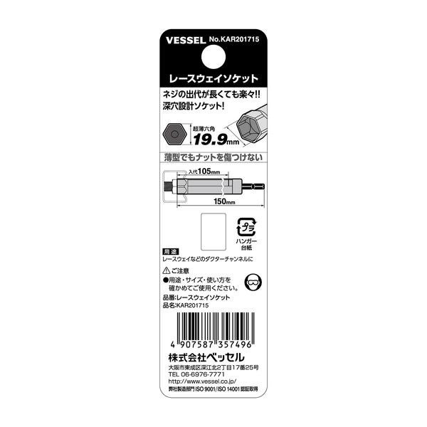 ベッセルメーカーお問い合わせ:0120-999-914【商品説明】●薄型六角で、チャンネル枠に引っかかりにくい。●ナットの六角を傷つけないソケット形状。●ネジの出代が長くても安心、深穴設計。●18Vインパクト対応軸折れに強い、軸圧入式。【用途】●レースウェイ(ダクターチャンネル)のナット取り付け・取りはずし●対辺17mm●深型チャンネル用入代105mm●外側対辺19.9mm●全長150mm●ソケット部:SCM鋼パイプ材