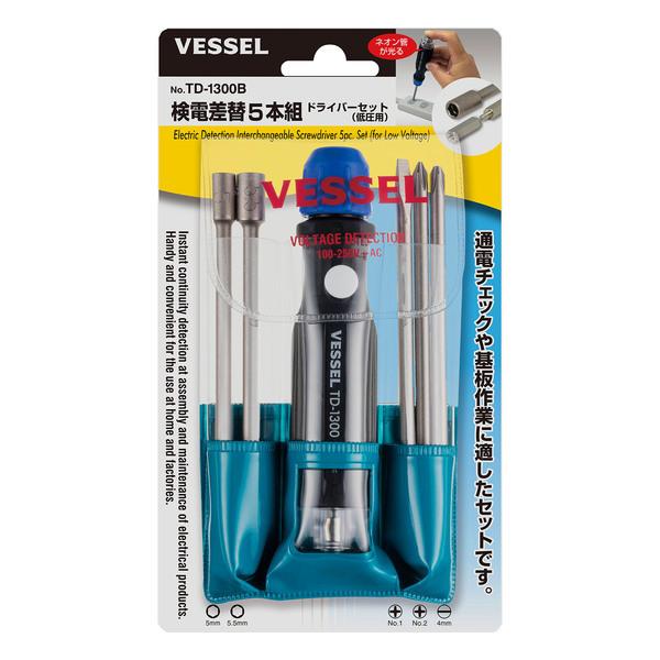 ベッセルメーカーお問い合わせ:0120-999-914【特長】●低圧用検電ドライバーのセットです。●一般家庭や工場における電気製品の電源の通電チェックができます。●ハンドル内部のネオンが光って通電を確認できます。●差替えが簡単なチャック式ハンドルで、よく使用されるナットサイズ(H5、H5.5mm)をセットしました。●携帯・収納に便利なビニールケース入りです。【用途】●基盤作業や、一般家庭や工場での電気製品の検電・修理に。家庭の常備工具、携帯工具に。PC周辺機器や電化製品、配電盤でのメンテナンスに。【仕様】●交流電圧(V):100~250●軸長(mm):70●全長(mm):195●軸径(mm):5●グリップ径(mm):26.5●差替軸:(+)1、(+)2、(-)4、H5、H5.5【仕様2】●ビニールケース入り【材質/仕上】●軸:特殊合金鋼●グリップ:ABS樹脂、ポリプロピレン●ケース:塩化ビニール【注意】●正しい用途・サイズ・使い方を確かめてご使用ください。●電気作業ではショート・感電にご注意ください。●使用前には、必ず点灯確認してください。●検電範囲内でご使用ください。【原産国】タイ