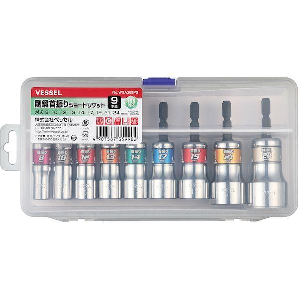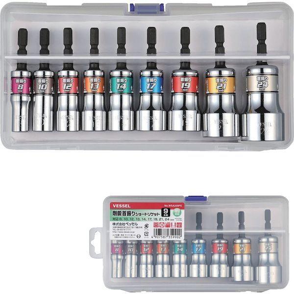 ベッセルメーカーお問い合わせ:0120-999-914【特長】●より狭い箇所のソケット作業に最適な「首振りショート」ソケットの9本組です。●ソケット部を押し込むと固定し、引き出すと15°の角度で自在になります。●電動インパクトドライバーが入りにくい角際作業で活躍します。●面接触型12角が、作業性アップとボルト・ナットの角を傷めにくくします。(対辺8mmを除く)●保管・収納に便利なケース付きです。【用途】●各種ソーラー架台の取付、空調ダクト工事、スチール棚の組立、スチール物置の組立、ガードレールや足場など等。【仕様】●セット内容(点):9●差込角(mm):6.35●セット内容(mm):8、10、12、13、14、17、19、21、24【仕様2】●錆びに強いクロームメッキ、ミラー仕上げ●18V対応●ショートタイプ●面接触型12角●ケース付き【材質/仕上】●本体:クロムバナジウム鋼●軸:特殊合金鋼【セット内容/付属品】●セット内容(対辺):8、10、12、13、14、17、19、21、24●軸寸法(mm):6.35●セット:内容(点):9●サイズ(mm):幅227×奥行105×高38●質量(g):840【原産国】中国