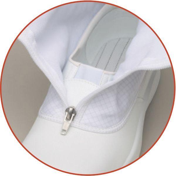 ミドリ安全メーカーお問い合わせ:048-989-3177【特長】●足裏形状でフィットする3Dフットベットにより、足ブレが少なく安定した姿勢維持と歩行が可能です。●かかと部は納まりが良くなり、効率よく衝撃を吸収するので足への負担を軽減します。●又、アーチクッションと中足パッドが足のバネの役割を果たすアーチを支えています。●つまずき防止の為トウスプリングを上げ、凸部がない設計でつまずきを予防します。●エグリ形状になったかかとの部分が歩行時に変形し効率よく衝撃を吸収。●足への負担を軽減します。●つま先の損傷を防ぐ、ウレタン製「フルCAP」を搭載。●ソールとの一体成型により優れた耐久性も実現しました。●新設計のエッジが総ラウンド形状の凸型デザインを採用。●エッジの欠け、脱落を防ぎます。【仕様】●色:ホワイト●足幅サイズ:EEE●寸法(cm):26.5●タイプ:フード【仕様2】●JIS T 8103 ED-O/C2/人工皮革/S合格●IEC61340-5-1に準拠●耐圧迫性荷重:10±0.1kN●色:ホワイト●ファスナー付●電気抵抗値:1.0×10[[の5-8乗]]Ω(23℃ C2)【材質/仕上】●甲被:人工皮革●筒部:ポリエステル●靴底:新発泡ポリウレタン2層●先芯:ワイド樹脂【注意】●クリーンパックではありません。【原産国】日本