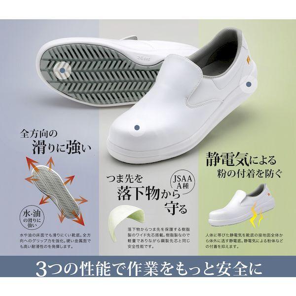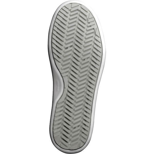 ミドリ安全メーカーお問い合わせ:048-989-3177【特長】●人体に帯びた静電気を靴底から逃すことで、スパークを防止し、静電気による粉体などの付着も抑えます。●靴底パターンを斜めに配置し、前後だけでなく横・斜め方向へのグリップ力を強化しました。●グレーチングのような硬い金属面や凹凸のあるタイルなど、様々な床材で耐滑性能を発揮します。●交換目安が分かる「スリップサイン」付で、靴底のすり減りによる耐滑機能低下をお知らせします。●靴底に、油を使う環境でも膨張や硬化を起こしにくい合成ゴムを使用しています。●抗菌・防臭加工のインソールを使用しています。●目詰まりしてもゴミが取れやすい靴底パターンです。【用途】●印刷工場●食品工場●厨房●食堂●清掃作業【仕様】●寸法(cm):27.0●足幅サイズ:EEE●色:ホワイト●耐圧迫荷重(kN):耐圧迫性荷重:10±0.1kN●US(アメリカ)規格サイズ:9●UK(イギリス)規格サイズ:9●EU(ヨーロッパ)規格サイズ:44【仕様2】●JSAA A種認定●JIS T 8103(一般静電保護靴に準拠)●耐圧迫性荷重:10±0.1kN【材質/仕上】●甲被:人工皮革●先芯:ワイド樹脂●靴底:EVA/合成ゴム【原産国】中国