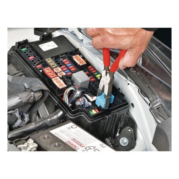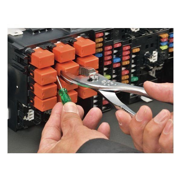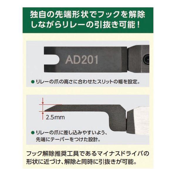 【商品説明】●全長(L1;mm):185●寸法L2(mm):60●幅(W;mm):47●重量(g):188●大型車などに使用されている脱落防止用フック付きリレーにも対応。一本でロックを解除しながらリレーを引き抜けます。●独自のクロー形状で、ロック解除に必要な分だけフックを広げるので、フックを破損させません。●リレー周辺が狭く、手では引き抜くことが困難な個所に最適です。●自動車に使用されているW22.5×D15×H25.5mmのプラグイン端子リレーの取外し専用。●補給部品としてクローセット(AD201-1)を設定しています。