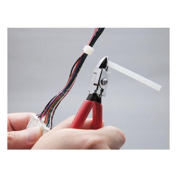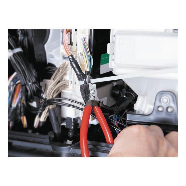 【商品説明】●全長(L;mm):130●寸法l(mm):16.5●寸法W1(mm):14●寸法W2(mm):48●寸法T(mm):8.5●質量(g):90●樹脂製結束バンド(幅2.2~4.8mm、厚さ1.0~1.5、長さ300mm以下)の切断用工具です。●ホールドパーツにより結束バンドの切れ端が飛散せず、安全に作業出来ます。●樹脂専用刃のため、通常の鉄線用ニッパと比べて結束バンドの切断面に突起がなく、切断面も突き出さないため、作業中の怪我を防止します。●カーナビやカーオーディオ、バックカメラの取り付けや高所での電工作業に最適です。●樹脂製結束バンドの切断に。【注意事項】※樹脂専用。鉄線や銅線には使用できません。※電気が流れているものには使用しないでください。※グリップの樹脂は絶縁のためのものではありません。※刃物ですので、使用回数や使い方により劣化します。※工具は本来の使用目的以外には使用しないでください。