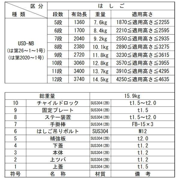 ●特徴:緊急時にバルコニーから安心安全に避難できる避難器具です。はしごの揺れがより少なくなった半固定。チャイルドロック(安全装置)仕様で、収納時は上蓋を閉めるとチャイルドロックも同時にロックします。避難口は、避難上有効な、直径500mm以上の円が内接する大きさを有しています。]●用途:マンション、アパート、工場、倉庫、施設等のベランダの非常用避難ハッチ、避難はしご※注意:※枠、はしご等の取り付けはお客様にて確実に施工して下さい。※消防申請・検査等はついておりません!●セット内容:USD-52NB+SD-7●枠(型名):USD-52NB●はしご(型名):SD-7●避難口寸法(内寸)(mm):520×600●枠厚さ(H寸法)(mm):200●枠重量(kg):15.9●枠材質:SUS304(2B)●枠認定番号:Hh-109(全国避難設備工業会)●適用階高(mm):2550≦2935●はしご有効長(mm):2040●はしご重量(kg):901●はしご段数:7●はしご材質:鉄(三価クロメート処理+カチオン電着塗装)●はしご認定(国家検定合格品):は第2020~1号ベランダ避難ハッチ 避難はしご ベランダ避難器具 マンション避難はしご ヤマトプロテック 避難ハッチ オリロー 避難ハッチ ORIRO 避難ハッチ ナカ工業 タスカール ナカ工業 避難ハッチ マルニシ避難ハッチ 城田鉄工 避難器具 タスカールSPC SPCハッチ 避難はしご 避難梯子 セフテック 避難はしご セフテック 避難ハッチ ベランダ用避難はしご