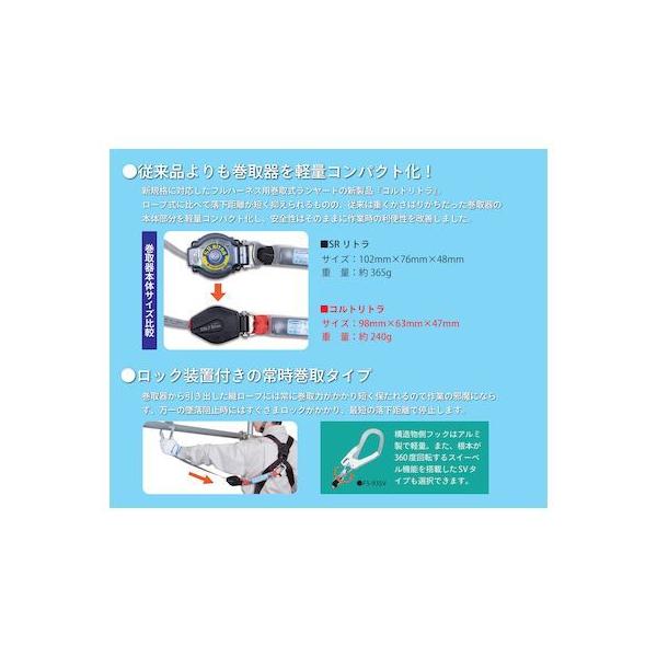 藤井電工メーカーお問い合わせ:0795-48-3360【商品説明】●特徴●従来よりも巻取機を軽量コンパクト化!ロープ式に比べ落下距離が短く抑えられるものの、従来は重くかさばりがちだった巻取機の本体部分を軽量コンパクト化し、安全性はそのままに作業時の利便性を改善しました。従来のSRリトラに比べ、約35%(約125g)軽くなっています。●ロック装置付きの常時巻取タイプ巻取機から引き出した織ロープには常に巻取力がかかり短く保たれるので作業の邪魔にならず、万一の墜落阻止時にはすぐさまロックがかかり、最短の落下距離で停止します。●360度回転式のフックFS-93SV根本が360度回転するSV機能付きフックを搭載し、ねじれを防ぎます。●ツインランヤードタイプ●仕様●織ロープ巻取り式(ロック装置/常時巻取り型)●サイズ:幅18mm×長さ1600mm●フック:FS-93SV(軽量・SV回転)●ショックアブソーバー:第一種●重さ:約1570g