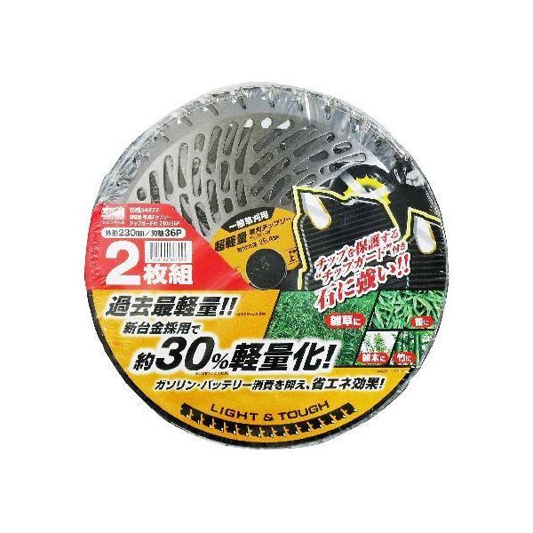 【商品説明】●お得な2枚組●当社オリジナル「超軽量化」新台金採用で約30%軽量化!※穴明け前との比較●ガソリン・バッテリーの消費を抑え「省エネ効果」。エンジン式刈払機や充電式刈払機にも使用可能!●低速で使用しても切れ味の良いチップソーです。●斜め埋め込みチップで衝撃に強い!四面研磨チップで良く切れる!●石に強い!「チップガード」チップを保護するコブ形状!回転中のチップを石や異物から守ります。●<一般草刈用スタンダード品> ◎雑草 ○笹 △雑木・竹●外径230mm 刃数36P 取付穴径25.4mm●推奨刈払機(草刈機)エンジン式:25cc未満、充電式(バッテリー式):36V未満 ※ご使用の草刈機の取り取扱説明書でご確認ください。●草刈 刈払 刈払機 チップソー 下刈 雑草 除草 家庭菜園 ガーデニング
