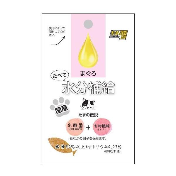 【商品説明】●普段お水を飲んでくれない子やドライフードの食事が多い猫ちゃんに。おいしく食べながら、大切な水分補給ができます。●原材料:まぐろ、まぐろエキス、食物繊維(オオバコ)、かつお節、はちみつ、乳酸菌(加熱処理)、増粘安定剤(キサンタンガム)●保証成分:粗たんぱく質5%以上、粗脂肪0.1%以上、粗繊維1%以下、粗灰分1%以下、水分95%以下●エネルギー:9kcal/袋●賞味期限:24ヶ月●原産国または製造地:日本(静岡県)猫 フード ウェット パウチ レトルト 国産 日本 たま伝