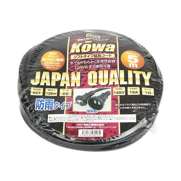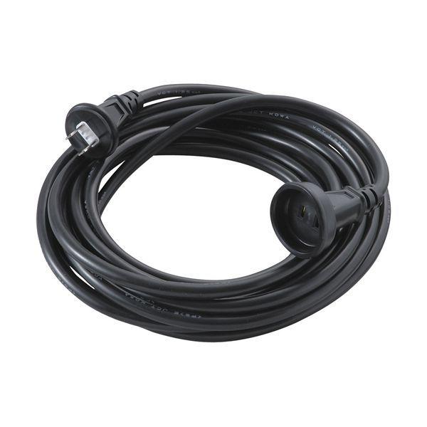【商品説明】雨の日も安心な防雨型延長コードです。【用途】15A1ツ口5メートル防雨型延長コード。【機能・特長】耐寒性に優れたやわらかい電線を使用した延長コードです。屋外型の防雨型延長コードです。【材質】導体:銅線。栓刃:黄銅。被覆:塩化ビニル。【仕様】●定格:15A・125V。●コンセント:2PX1ツ口。●色:黒。●電線サイズ:VCT2芯X1.25sq。●長さ:5M。●屋外型。【注意事項】このコードは合計1500W以下で使用して下さい。濡れた手でのプラグなどの抜き差しは決してしないで下さい。プラグはきっちりと差し込んでお使いください(接触不良で発熱する原因となります)。コードは束ねて使用したり、上から物を載せないで下さい(焼損の恐れがあり、火災の原因になります)。