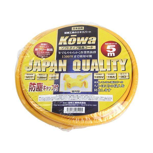 【商品説明】ソフトタイプ電線の延長コードです。【用途】15A3ッ口5メートル屋内型延長コード。【機能・特長】耐寒性に優れたやわらかい電線を使用した延長コードです。環境にやさしい鉛フリー製品です。【材質】導体:銅線。栓刃:黄銅。被覆:塩化ビニル。【仕様】●定格:15A・125V。●コンセント:2PX3ツ口。●色:黄。●電線サイズ:VCT2芯X1.25sq。●長さ:5M。●屋内用。【注意事項】このコードは合計1500W以下で使用して下さい。この製品は屋内型です(屋外・湿気の多い場所では決して使用しないで下さい)。濡れた手でのプラグなどの抜き差しは決してしないで下さい。プラグはきっちりと差し込んでお使いください(接触不良で発熱する原因となります)。コードは束ねて使用したり、上から物を載せないで下さい(焼損の恐れがあり、火災の原因になります)。