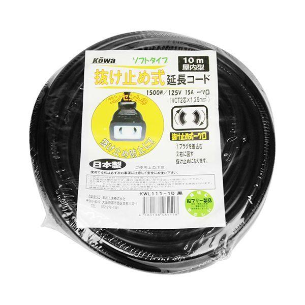 【商品説明】抜け止め式延長コードです。【用途】15A1ッ口10メートル屋内型延長コード。【機能・特長】耐寒性に優れたやわらかい電線を使用した延長コードです。環境にやさしい鉛フリー製品です。プラグを差し込んで右に回すと抜け止めになります。【材質】導体:銅線。栓刃:黄銅。被覆:塩化ビニル。【仕様】●定格:15A・125V。●コンセント:2PX1ツ口。●色:黒。●電線サイズ:VCT2芯X1.25sq。●長さ:10M。●屋内用。【注意事項】このコードは合計1500W以下で使用して下さい。この製品は屋内型です(屋外・湿気の多い場所では決して使用しないで下さい)。濡れた手でのプラグなどの抜き差しは決してしないで下さい。プラグはきっちりと差し込んでお使いください(接触不良で発熱する原因となります)。コードは束ねて使用したり、上から物を載せないで下さい(焼損の恐れがあり、火災の原因になります)。