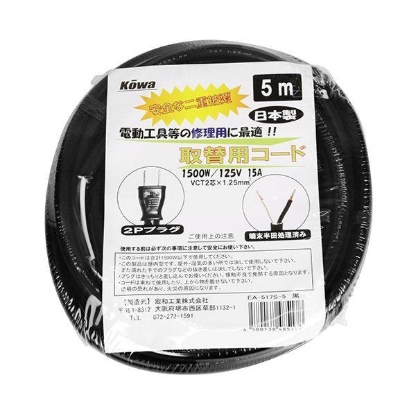 【商品説明】電動工具用補修用コードです。【用途】15A3メートル2芯修理用コード。【機能・特長】端末はハンダ処理済です。電動工具コードなどの修理に最適です。【材質】導体:銅線。栓刃:黄銅。被覆:塩化ビニル。【仕様】●定格:15A・125V。●色:黒。●電線サイズ:VCT2芯X1.25sq。●長さ:5M。●2Pプラグ。●端末半田処理済。【注意事項】このコードは合計1500W以下で使用して下さい。この製品は屋内型です(屋外・湿気の多い場所では決して使用しないで下さい)。濡れた手でのプラグなどの抜き差しは決してしないで下さい。プラグはきっちりと差し込んでお使いください(接触不良で発熱する原因となります)。コードは束ねて使用したり、上から物を載せないで下さい(焼損の恐れがあり、火災の原因になります)。