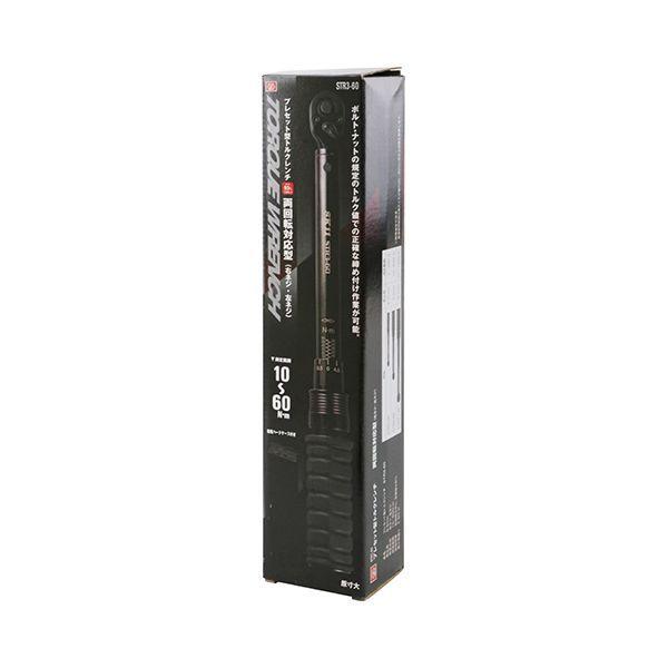 【商品説明】両回転対応型で右ネジ・左ネジのトルク測定が可能です。【用途】ボルト・ナットの規定トルク値での正確な締め付け作業。【機能・特長】目を引く美しいブラックボディに金色の目盛り表示なので視認性は抜群です。トルク設定範囲は10~60N・mというワイドレンジモデルで幅広い用途に使用いただけます。測定時のグリップロックはスリーブを引き下げるだけの簡単操作で確実にロックでき、握りやすく滑りにくいエラストマー樹脂グリップ採用しているので手への負担を軽減します。トルク設定時のグリップ回転は滑らかなで操作性が良いです。ソケットの着脱はヘッド部のボタンを押すだけで簡単操作で確実に保持します。【仕様】●トルク測定範囲:10~60N・m(右ネジ・左ネジの両回転対応型)。●測定精度:右回転±3%、左回転±5%。●最小目盛り:0.5N・m。●差込角:9.5mm。●ラチェットギア数:36山。●検査成績表付属。●専用ハードケース付き。