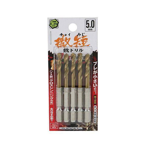 【商品説明】ブレが小さい、ハイス鋼クロスシンニング刃先で食い付き抜群の微短鉄ドリルです。【用途】鉄、木、樹脂、軽金属の穴あけ。【機能・特長】ハイス鋼(HSS)にチタン(Tin)をコーティング、耐熱性能が上がり長寿命です。六角軸なのでインパクトドライバーなどのチャックに直接セットできます。クロスシンニング刃先で食い付き抜群です。お得な5本組です。【仕様】●サイズ:5.0mm。●標準穴あけ可能厚:(鉄)2.0mm・(木)らせん溝長の2/3程度。●軸:六角軸6.35mm。●使用電動工具:充電式インパクトドライバー・ドリルドライバー・電気ドリル。●加工材料:鉄・木・樹脂・軽金属。●5本組。【注意事項】用途以外のご使用はしないで下さい。ご使用前に本製品に亀裂や欠け、軸のゆるみがないかご確認下さい。使用する電動工具本体の取扱説明書をよく読み正しくご使用下さい。保護メガネやマスク等の作業に適した服装でご使用下さい。まわりの安全をご確認いただきご使用下さい。揮発性可燃物(ガソリンやシンナーなど)の近くではご使用にならないで下さい。ドリル刃には十分注意して下さい。加工材料は動かないようにしっかり固定して下さい。使用後のドリル刃及び加工材料は高温になります。ドリル推奨回転数を目安に使用下さい。市販の水溶性切削油のご使用をお勧めします。無理な負荷をかけてご使用にならないで下さい。