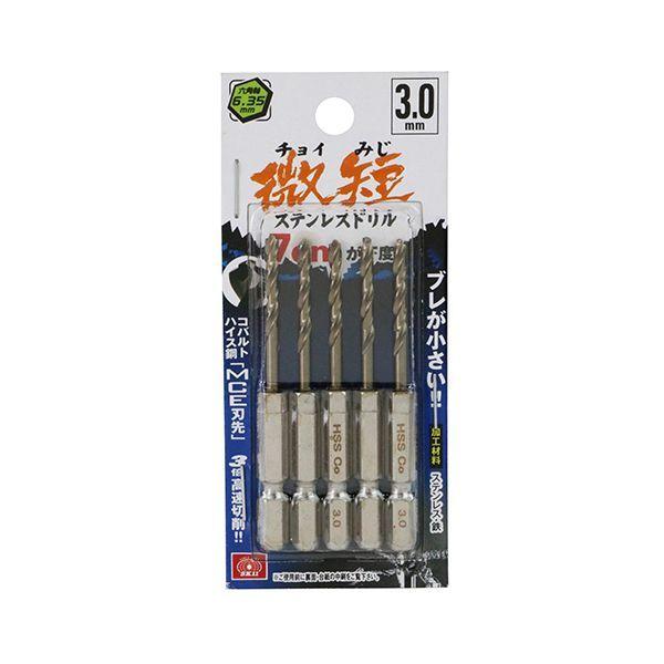 【商品説明】ブレが小さい、コバルトハイス鋼MCE刃先で従来比3倍の高速切断が可能な微短ステンレスドリルです。【用途】ステンレス、鉄の穴あけ。【機能・特長】コバルトハイス鋼(Co-HSS)を使用し、高温時の耐摩耗性が高く、ステンレス鋼の切削に最適です。鉄への切削にも寿命抜群です。六角軸なのでインパクトドライバーなどのチャックに直接セットできます。MCE(マルチカッティングエッジ)刃先により切れ味抜群、食い付きと早切れ性能は従来比の3倍です。お得な5本組です。【仕様】●サイズ:3.0mm。●標準穴あけ可能厚:(ステンレス)1.0mm・(鉄)2.0mm。●軸:六角軸6.35mm。●使用電動工具:充電式インパクトドライバー・ドリルドライバー・電気ドリル。●加工材料:ステンレス・鉄。●5本組。【注意事項】用途以外のご使用はしないで下さい。ご使用前に本製品に亀裂や欠け、軸のゆるみがないかご確認下さい。使用する電動工具本体の取扱説明書をよく読み正しくご使用下さい。保護メガネやマスク等の作業に適した服装でご使用下さい。まわりの安全をご確認いただきご使用下さい。揮発性可燃物(ガソリンやシンナーなど)の近くではご使用にならないで下さい。ドリル刃には十分注意して下さい。加工材料は動かないようにしっかり固定して下さい。使用後のドリル刃及び加工材料は高温になります。ドリル推奨回転数を目安に使用下さい。市販の水溶性切削油のご使用をお勧めします。無理な負荷をかけてご使用にならないで下さい。
