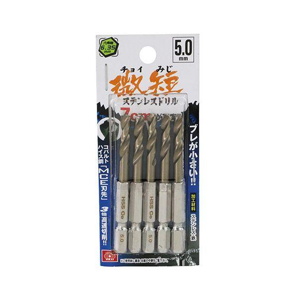 【商品説明】ブレが小さい、コバルトハイス鋼MCE刃先で従来比3倍の高速切断が可能な微短ステンレスドリルです。【用途】ステンレス、鉄の穴あけ。【機能・特長】コバルトハイス鋼(Co-HSS)を使用し、高温時の耐摩耗性が高く、ステンレス鋼の切削に最適です。鉄への切削にも寿命抜群です。六角軸なのでインパクトドライバーなどのチャックに直接セットできます。MCE(マルチカッティングエッジ)刃先により切れ味抜群、食い付きと早切れ性能は従来比の3倍です。お得な5本組です。【仕様】●サイズ:5.0mm。●標準穴あけ可能厚:(ステンレス)1.0mm・(鉄)2.0mm。●軸:六角軸6.35mm。●使用電動工具:充電式インパクトドライバー・ドリルドライバー・電気ドリル。●加工材料:ステンレス・鉄。●5本組。【注意事項】用途以外のご使用はしないで下さい。ご使用前に本製品に亀裂や欠け、軸のゆるみがないかご確認下さい。使用する電動工具本体の取扱説明書をよく読み正しくご使用下さい。保護メガネやマスク等の作業に適した服装でご使用下さい。まわりの安全をご確認いただきご使用下さい。揮発性可燃物(ガソリンやシンナーなど)の近くではご使用にならないで下さい。ドリル刃には十分注意して下さい。加工材料は動かないようにしっかり固定して下さい。使用後のドリル刃及び加工材料は高温になります。ドリル推奨回転数を目安に使用下さい。市販の水溶性切削油のご使用をお勧めします。無理な負荷をかけてご使用にならないで下さい。