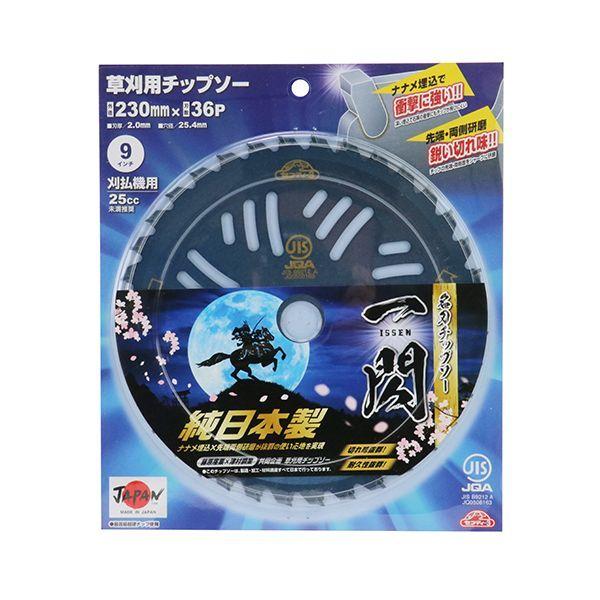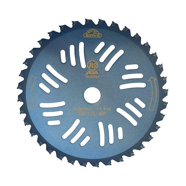 【商品説明】純日本製、藤原産業×津村鋼業共同企画チップソーです。【用途】刈払機用チップソー。【機能・特長】研磨やロウ付け作業等全て日本で製造・加工を行ったチップソーになります。4面研磨+最高級チップ搭載で抜群の切味と耐久性を実現しました。【材質】台金材質:SK-85。【仕様】●外径:230mm。●刃数:36P。●刃厚:2.0mm。●穴径:25.4mm。●25cc未満刈払機推奨。●JIS規格適合商品。【注意事項】刈払機の安全カバーを適切に装着し、防災メガネ、ヘルメット、手袋、長袖、長ズボン、長靴を必ず着用して下さい。この刈刃は刈払機専用ですのでそれ以外の使用は絶対にしないで下さい。作業用途に合ったチップソーを選定して下さい。特に雑草用のチップソーで灌木等の雑木は絶対に切断しないで下さい。チップソーにヒビ割れが無いか目立ては出来ているかよく確認して下さい。チップソーの締付けネジは確実に締付けて下さい。刈払機を試運転し、ガタツキ、ブレなどがないかを点検し、安全を確認して下さい。横振れ、外周振れの大きなチップソーは1刃当たりの切断負荷のバランスがくずれ振動発生の原因となりますので刈払機メーカー指定外の大きな外径のチップソーと同じく絶対に使用しないで下さい。作業をする時は、周囲に人がいないことを確認して少なくとも周囲15メートル以内には人を近づけないようにして行ってください。石、缶、ビン、電線等の硬質異物にチップソーが当たらないように、作業はそれら硬質異物を避けるように充分注意して行って下さい。チップソー回転数はチップソーがもし硬質異物に当たった時の衝撃による破損を少しでも少なくするために毎分6000回転以下で使用して下さい。高速回転は危険です。安全のため激しい衝撃を加えない様に作業を行って下さい。作業中にチップソーの異常な振動又は衝撃を感じたら直ちに刈払機のエンジンを停止してチップソーのヒビ割れ等の確認をして下さい。チップソーの異常を発見したら、そのチップソーは絶対に継続使用しないで下さい。作業終了時にはエンジンを停めチップソーを刈払機から取り外してチップソーにヒビ割れ、変形、摩耗等の異常が無いか点検確認して下さい。もしヒビ割れ、変形等の異常の場合は絶対に再使用せずに破棄して下さい。摩耗の場合は清掃の上で適切な目立てをして下さい。次回使用のために防錆油等で防錆処理の後に幼児の手の届かない安全な場所に保管してください。