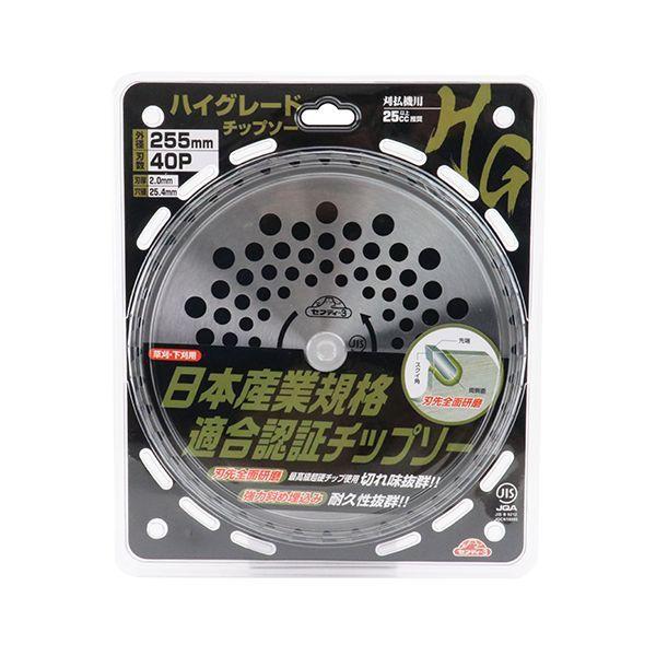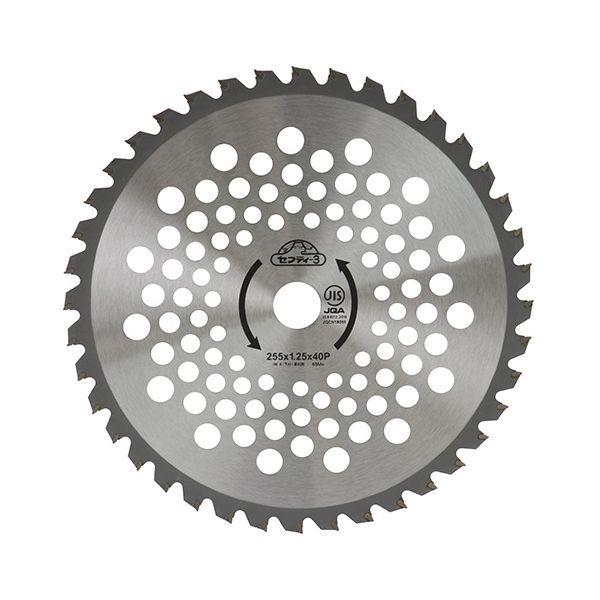 【商品説明】安心のJIS規格適合認証商品、軽量タイプで快適に作業できます。【用途】刈払機用チップソー。【機能・特長】チップ部4面研磨で切れ味抜群です。強力斜め埋込みで耐久性抜群です。【材質】台金材質:Mn65。【仕様】●外径:255mm。●刃数:40P。●刃厚:2.0mm。●台金厚:1.25mm。●穴径:25.4mm。●25cc以上刈払機推奨。●JIS規格適合商品。【注意事項】刈払機の安全カバーを適切に装着し、防災メガネ、ヘルメット、手袋、長袖、長ズボン、長靴を必ず着用して下さい。この刈刃は刈払機専用ですのでそれ以外の使用は絶対にしないで下さい。作業用途に合ったチップソーを選定して下さい。特に雑草用のチップソーで灌木等の雑木は絶対に切断しないで下さい。チップソーにヒビ割れが無いか目立ては出来ているかよく確認して下さい。チップソーの締付けネジは確実に締付けて下さい。刈払機を試運転し、ガタツキ、ブレなどがないかを点検し、安全を確認して下さい。横振れ、外周振れの大きなチップソーは1刃当たりの切断負荷のバランスがくずれ振動発生の原因となりますので刈払機メーカー指定外の大きな外径のチップソーと同じく絶対に使用しないで下さい。作業をする時は、周囲に人がいないことを確認して少なくとも周囲15メートル以内には人を近づけないようにして行ってください。石、缶、ビン、電線等の硬質異物にチップソーが当たらないように、作業はそれら硬質異物を避けるように充分注意して行って下さい。チップソー回転数はチップソーがもし硬質異物に当たった時の衝撃による破損を少しでも少なくするために毎分6000回転以下で使用して下さい。高速回転は危険です。安全のため激しい衝撃を加えない様に作業を行って下さい。作業中にチップソーの異常な振動又は衝撃を感じたら直ちに刈払機のエンジンを停止してチップソーのヒビ割れ等の確認をして下さい。チップソーの異常を発見したら、そのチップソーは絶対に継続使用しないで下さい。作業終了時にはエンジンを停めチップソーを刈払機から取り外してチップソーにヒビ割れ、変形、摩耗等の異常が無いか点検確認して下さい。もしヒビ割れ、変形等の異常の場合は絶対に再使用せずに破棄して下さい。摩耗の場合は清掃の上で適切な目立てをして下さい。次回使用のために防錆油等で防錆処理の後に幼児の手の届かない安全な場所に保管してください。