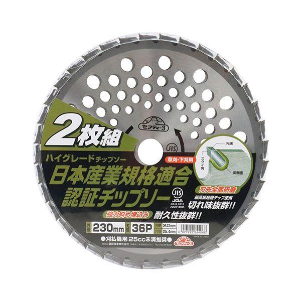 【商品説明】安心のJIS規格適合認証商品、軽量タイプで快適に作業できます。【用途】刈払機用チップソー。【機能・特長】チップ部4面研磨で切れ味抜群です。強力斜め埋込みで耐久性抜群です。【材質】台金材質:Mn65。【仕様】●外径:230mm。●刃数:36P。●刃厚:2.0mm。●台金厚:1.25mm。●穴径:25.4mm。●25cc未満刈払機推奨。●JIS規格適合商品。●2枚組。【注意事項】刈払機の安全カバーを適切に装着し、防災メガネ、ヘルメット、手袋、長袖、長ズボン、長靴を必ず着用して下さい。この刈刃は刈払機専用ですのでそれ以外の使用は絶対にしないで下さい。作業用途に合ったチップソーを選定して下さい。特に雑草用のチップソーで灌木等の雑木は絶対に切断しないで下さい。チップソーにヒビ割れが無いか目立ては出来ているかよく確認して下さい。チップソーの締付けネジは確実に締付けて下さい。刈払機を試運転し、ガタツキ、ブレなどがないかを点検し、安全を確認して下さい。横振れ、外周振れの大きなチップソーは1刃当たりの切断負荷のバランスがくずれ振動発生の原因となりますので刈払機メーカー指定外の大きな外径のチップソーと同じく絶対に使用しないで下さい。作業をする時は、周囲に人がいないことを確認して少なくとも周囲15メートル以内には人を近づけないようにして行ってください。石、缶、ビン、電線等の硬質異物にチップソーが当たらないように、作業はそれら硬質異物を避けるように充分注意して行って下さい。チップソー回転数はチップソーがもし硬質異物に当たった時の衝撃による破損を少しでも少なくするために毎分6000回転以下で使用して下さい。高速回転は危険です。安全のため激しい衝撃を加えない様に作業を行って下さい。作業中にチップソーの異常な振動又は衝撃を感じたら直ちに刈払機のエンジンを停止してチップソーのヒビ割れ等の確認をして下さい。チップソーの異常を発見したら、そのチップソーは絶対に継続使用しないで下さい。作業終了時にはエンジンを停めチップソーを刈払機から取り外してチップソーにヒビ割れ、変形、摩耗等の異常が無いか点検確認して下さい。もしヒビ割れ、変形等の異常の場合は絶対に再使用せずに破棄して下さい。摩耗の場合は清掃の上で適切な目立てをして下さい。次回使用のために防錆油等で防錆処理の後に幼児の手の届かない安全な場所に保管してください。