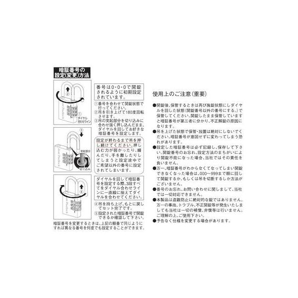 株式会社ツチノメーカーお問い合わせ:06-6723-6407【商品説明】●お好きな暗証番号を自由に設定してご利用して頂けます。●ロッカー、郵便ボックス、カバン、ポストなどの施開錠に。●吊(シャックル部分)はステンレス製で防錆性に優れています。●材質:本体/真鍮製吊/ステンレス製ダイヤル/真鍮製