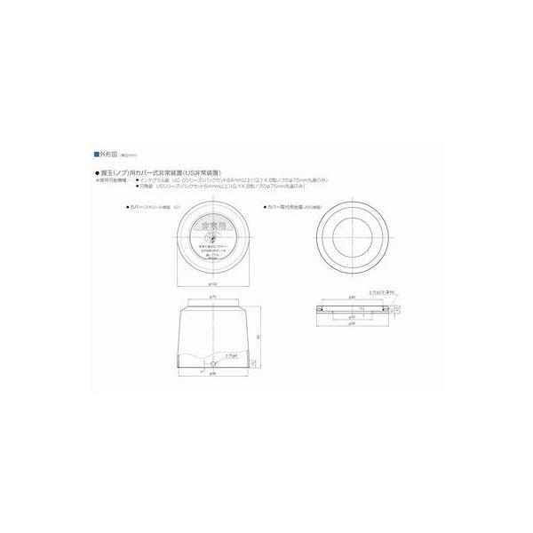 【商品説明】●ノブに取り付けるカバー式非常装置で、非常時には、カバーを割って非常解錠できます。●既設の錠にも取り付けることができます。●ノブ用カバー式非常装置(US非常装置)の適用機種・インテグラル錠UC、Gシリーズ(バックセット64mm以上)のQ、Y,K,B型ノブでΦ75mmの丸座。・円筒状USシリーズ(バックセット64mm以上)のQ、Y,K,B型ノブでΦ75mmの丸座。●注意:カバー式非常装置他はプラスチック製のカバーと取り付けようの台座とのセットとなっています。