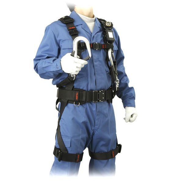 (株)TJMデザインメーカーお問い合わせ:0120-125577【商品説明】●特徴●軽量アルミワンタッチバックルのハーネスZA Lサイズ●蛇腹式ダブルランヤード+軽量アルミ鍛造フック より戻し付きA1JR150WL8BK●フィット感抜群の超立体胴当てベルトCRX●軽量な鍛造アルミワンタッチバックルの胴ベルト黒バックル●LEDセフ着脱式ライトと肩パットを今だけプレゼント!●仕様、規格●種類:フルハーネス 型用タイプ1●使用可能質量:100kg以下●ランヤード長:1.5m●ショックアブゾーバ種別:第一種(4kN)●最大自由落下距離:2.3m●落下距離:4.1m●参考適合身長:175~185cm