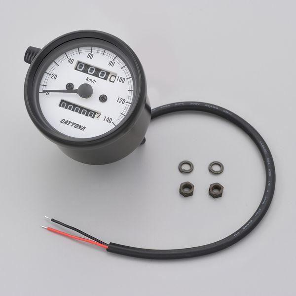 デイトナメーカーお問い合わせ:0120-60-4955【商品説明】旧車カスタム素材の定番、復活。クラシカルなパネルデザインのスピードメーター。夜間でも視認しやすいLEDバックライトの文字盤を採用。●140km/h●ブラックボディ ホワイトパネル●取り付けには防振メーターステーが必要です●12Vバッテリー車専用※ 取り付けには、防振メーターステーが必要です。※ スピードメーターは国産モデルで一般な「60km/h=1,400rpm」規格の純正機械式メーター車(メーターケーブルを使用する車両)であれば基本的に使用できます。メーター規格が異なる外車や、一部旧車などには使用できません。※ 12Vバッテリー車専用。バッテリーレス車、6Vバッテリー車(12V電装にコンバートしたモデルも含む)では正常に作動しません。※ 完全防水ではありません。メーター内外の気温差や湿度により、ガラス面が曇る場合があります。※ 純正メーターを取り外すことによって、各種インジケーターが使用できなくなる場合があります。必要に応じて別途ご用意ください。※ メーターケーブルは消耗品です。アウターチューブに亀裂や破損があると、メーター内部に水分や油分、埃などが侵入し、故障の原因になります。機械式メーターを交換する際は必ずメーターケーブルの点検も同時に行ない、必要に応じて新品に交換してください。※ スピードメーターとタコメーターは内部構造と文字盤色の違いにより、発光状態(特に夜間)の差が出てしまいます。あらかじめご了承ください。※ハーネスの結線は車両に合わせた加工が必要です。ギボシ端子等は別途ご用意ください。