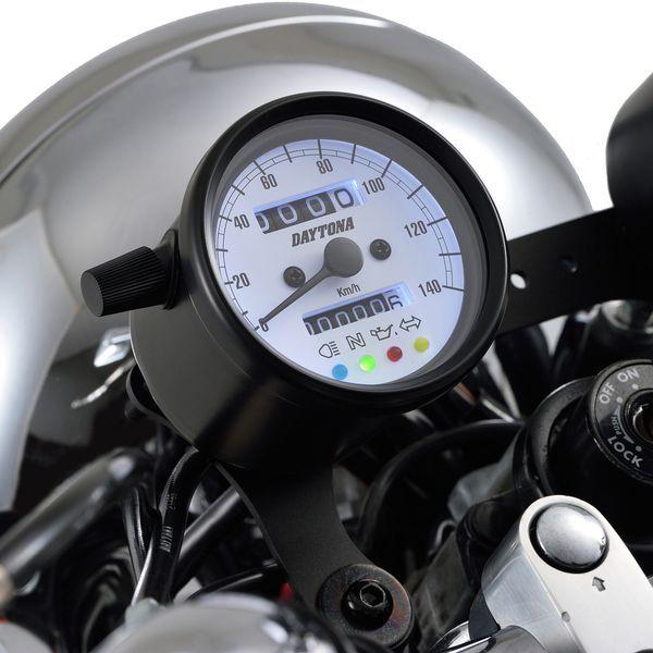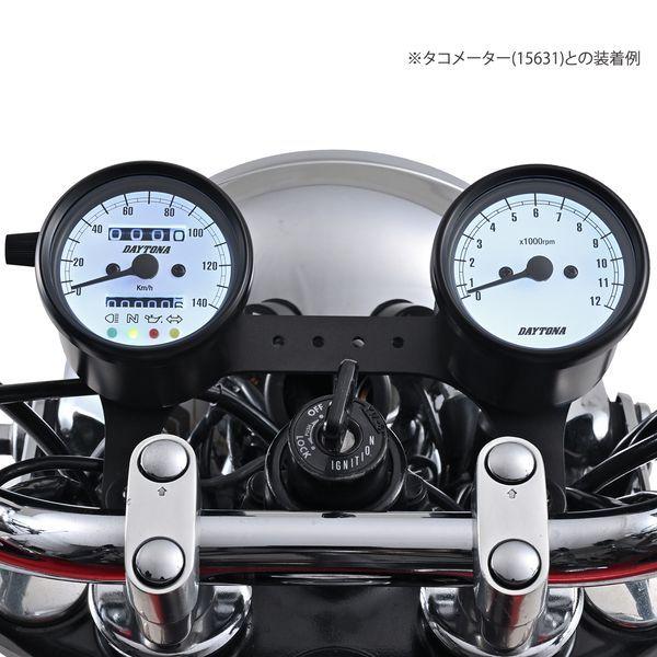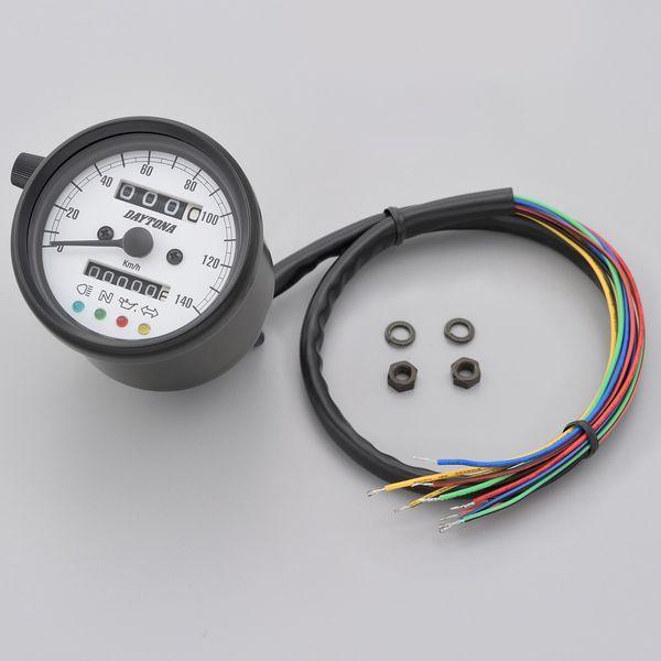 デイトナメーカーお問い合わせ:0120-60-4955【商品説明】旧車カスタム素材の定番、復活。クラシカルなパネルデザインのスピードメーター。夜間でも視認しやすいLEDバックライトの文字盤を採用。●インジケーター付き(ハイビーム、ニュートラル、油圧、ウインカー)●140km/h●ブラックボディ ホワイトパネル●取り付けには防振メーターステーが必要です●12Vバッテリー車専用※ 取り付けには、防振メーターステーが必要です。※ スピードメーターは国産モデルで一般な「60km/h=1,400rpm」規格の純正機械式メーター車(メーターケーブルを使用する車両)であれば基本的に使用できます。メーター規格が異なる外車や、一部旧車などには使用できません。※ 12Vバッテリー車専用。バッテリーレス車、6Vバッテリー車(12V電装にコンバートしたモデルも含む)では正常に作動しません。※ 完全防水ではありません。メーター内外の気温差や湿度により、ガラス面が曇る場合があります。※ 純正メーターを取り外すことによって、各種インジケーターが使用できなくなる場合があります。必要に応じて別途ご用意ください。※ メーターケーブルは消耗品です。アウターチューブに亀裂や破損があると、メーター内部に水分や油分、埃などが侵入し、故障の原因になります。機械式メーターを交換する際は必ずメーターケーブルの点検も同時に行ない、必要に応じて新品に交換してください。※ スピードメーターとタコメーターは内部構造と文字盤色の違いにより、発光状態(特に夜間)の差が出てしまいます。あらかじめご了承ください。※ハーネスの結線は車両に合わせた加工が必要です。ギボシ端子等は別途ご用意ください。