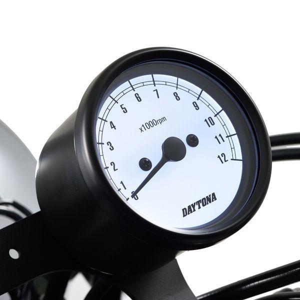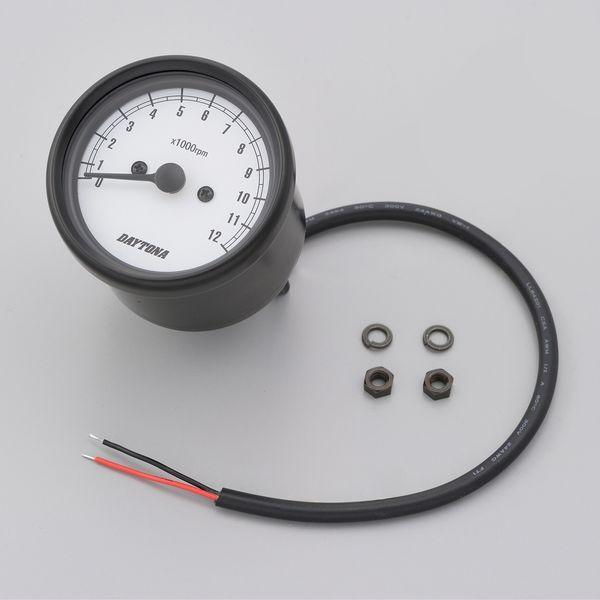 デイトナメーカーお問い合わせ:0120-60-4955【商品説明】旧車カスタム素材の定番、復活。クラシカルなパネルデザインのタコメーター。夜間でも視認しやすいLEDバックライトの文字盤を採用。●12,000rpm●ブラックボディ ホワイトパネル●取り付けには防振メーターステーが必要です●12Vバッテリー車専用※ 取り付けには、防振メーターステーが必要です。※ タコメーターはSRなどに採用されている「ギヤ比1:5」(クランク5回転=タコメーターケーブル1回転)」規格の純正機械式タコメーター(タコメーターケーブルを使用する車両)のみ適合。機械式タコメーターが標準装備されていない車両(FTRやTWなど)はもちろん、ギヤ比が異なる車両には使用できません。※ 12Vバッテリー車専用。バッテリーレス車、6Vバッテリー車(12V電装にコンバートしたモデルも含む)では正常に作動しません。※ 完全防水ではありません。メーター内外の気温差や湿度により、ガラス面が曇る場合があります。※ 純正メーターを取り外すことによって、各種インジケーターが使用できなくなる場合があります。必要に応じて別途ご用意ください。※ メーターケーブルは消耗品です。アウターチューブに亀裂や破損があると、メーター内部に水分や油分、埃などが侵入し、故障の原因になります。機械式メーターを交換する際は必ずメーターケーブルの点検も同時に行ない、必要に応じて新品に交換してください。※ スピードメーターとタコメーターは内部構造と文字盤色の違いにより、発光状態(特に夜間)の差が出てしまいます。あらかじめご了承ください。※ハーネスの結線は車両に合わせた加工が必要です。ギボシ端子等は別途ご用意ください。