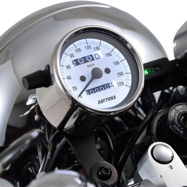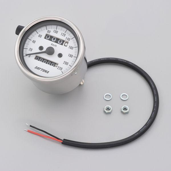 デイトナメーカーお問い合わせ:0120-60-4955【商品説明】旧車カスタム素材の定番、復活。クラシカルなパネルデザインのスピードメーター。夜間でも視認しやすいLEDバックライトの文字盤を採用。●220km/h●ステンレスボディ ホワイトパネル●取り付けには防振メーターステーが必要です●12Vバッテリー車専用※ 取り付けには、防振メーターステーが必要です。※ スピードメーターは国産モデルで一般な「60km/h=1,400rpm」規格の純正機械式メーター車(メーターケーブルを使用する車両)であれば基本的に使用できます。メーター規格が異なる外車や、一部旧車などには使用できません。※ 12Vバッテリー車専用。バッテリーレス車、6Vバッテリー車(12V電装にコンバートしたモデルも含む)では正常に作動しません。※ 完全防水ではありません。メーター内外の気温差や湿度により、ガラス面が曇る場合があります。※ 純正メーターを取り外すことによって、各種インジケーターが使用できなくなる場合があります。必要に応じて別途ご用意ください。※ メーターケーブルは消耗品です。アウターチューブに亀裂や破損があると、メーター内部に水分や油分、埃などが侵入し、故障の原因になります。機械式メーターを交換する際は必ずメーターケーブルの点検も同時に行ない、必要に応じて新品に交換してください。※ スピードメーターとタコメーターは内部構造と文字盤色の違いにより、発光状態(特に夜間)の差が出てしまいます。あらかじめご了承ください。※ハーネスの結線は車両に合わせた加工が必要です。ギボシ端子等は別途ご用意ください。