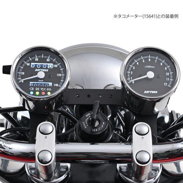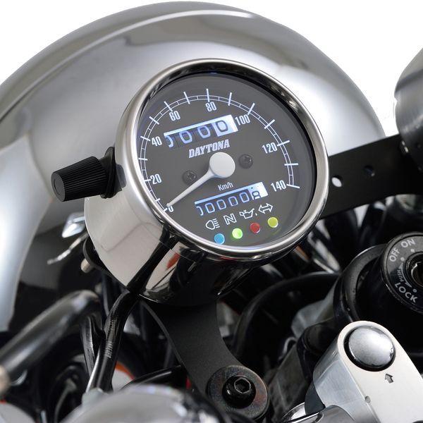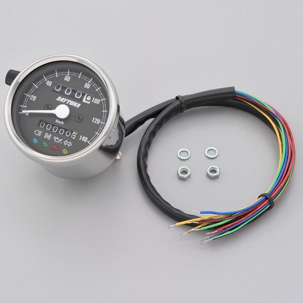 デイトナメーカーお問い合わせ:0120-60-4955【商品説明】旧車カスタム素材の定番、復活。クラシカルなパネルデザインのスピードメーター。夜間でも視認しやすいLEDバックライトの文字盤を採用。●インジケーター付き(ハイビーム、ニュートラル、油圧、ウインカー)●140km/h●ステンレスボディ ブラックパネル●取り付けには防振メーターステーが必要です●12Vバッテリー車専用※ 取り付けには、防振メーターステーが必要です。※ スピードメーターは国産モデルで一般な「60km/h=1,400rpm」規格の純正機械式メーター車(メーターケーブルを使用する車両)であれば基本的に使用できます。メーター規格が異なる外車や、一部旧車などには使用できません。※ 12Vバッテリー車専用。バッテリーレス車、6Vバッテリー車(12V電装にコンバートしたモデルも含む)では正常に作動しません。※ 完全防水ではありません。メーター内外の気温差や湿度により、ガラス面が曇る場合があります。※ 純正メーターを取り外すことによって、各種インジケーターが使用できなくなる場合があります。必要に応じて別途ご用意ください。※ メーターケーブルは消耗品です。アウターチューブに亀裂や破損があると、メーター内部に水分や油分、埃などが侵入し、故障の原因になります。機械式メーターを交換する際は必ずメーターケーブルの点検も同時に行ない、必要に応じて新品に交換してください。※ スピードメーターとタコメーターは内部構造と文字盤色の違いにより、発光状態(特に夜間)の差が出てしまいます。あらかじめご了承ください。※ハーネスの結線は車両に合わせた加工が必要です。ギボシ端子等は別途ご用意ください。