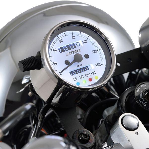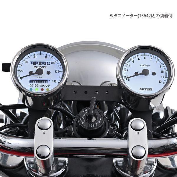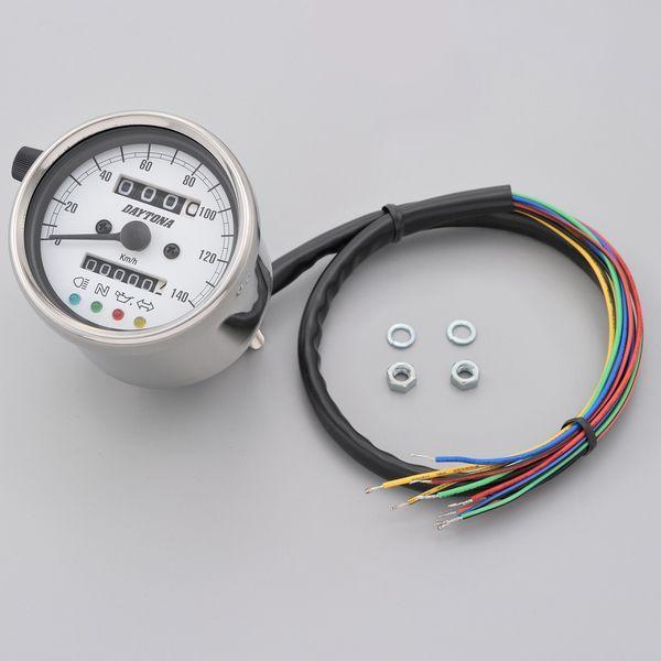 デイトナメーカーお問い合わせ:0120-60-4955【商品説明】旧車カスタム素材の定番、復活。クラシカルなパネルデザインのスピードメーター。夜間でも視認しやすいLEDバックライトの文字盤を採用。●インジケーター付き(ハイビーム、ニュートラル、油圧、ウインカー)●140km/h●ステンレスボディ ホワイトパネル●取り付けには防振メーターステーが必要です●12Vバッテリー車専用※ 取り付けには、防振メーターステーが必要です。※ スピードメーターは国産モデルで一般な「60km/h=1,400rpm」規格の純正機械式メーター車(メーターケーブルを使用する車両)であれば基本的に使用できます。メーター規格が異なる外車や、一部旧車などには使用できません。※ 12Vバッテリー車専用。バッテリーレス車、6Vバッテリー車(12V電装にコンバートしたモデルも含む)では正常に作動しません。※ 完全防水ではありません。メーター内外の気温差や湿度により、ガラス面が曇る場合があります。※ 純正メーターを取り外すことによって、各種インジケーターが使用できなくなる場合があります。必要に応じて別途ご用意ください。※ メーターケーブルは消耗品です。アウターチューブに亀裂や破損があると、メーター内部に水分や油分、埃などが侵入し、故障の原因になります。機械式メーターを交換する際は必ずメーターケーブルの点検も同時に行ない、必要に応じて新品に交換してください。※ スピードメーターとタコメーターは内部構造と文字盤色の違いにより、発光状態(特に夜間)の差が出てしまいます。あらかじめご了承ください。※ハーネスの結線は車両に合わせた加工が必要です。ギボシ端子等は別途ご用意ください。
