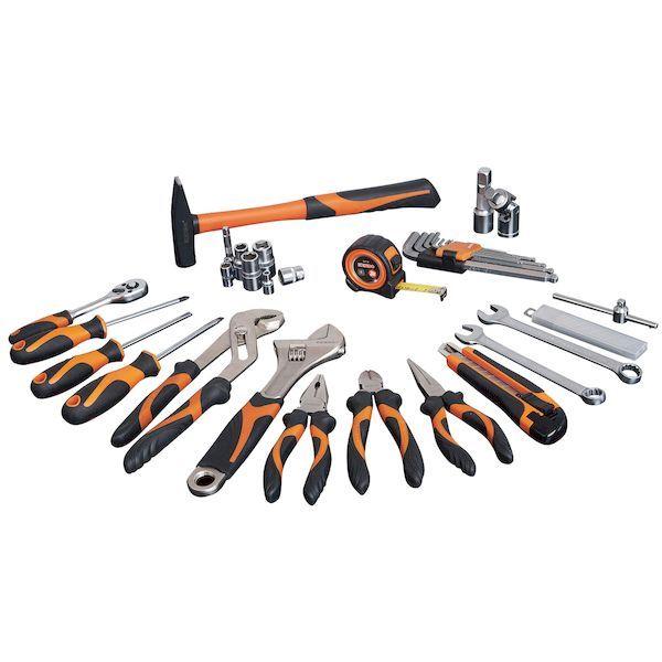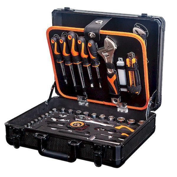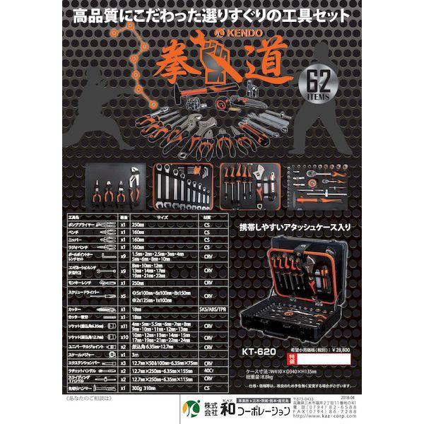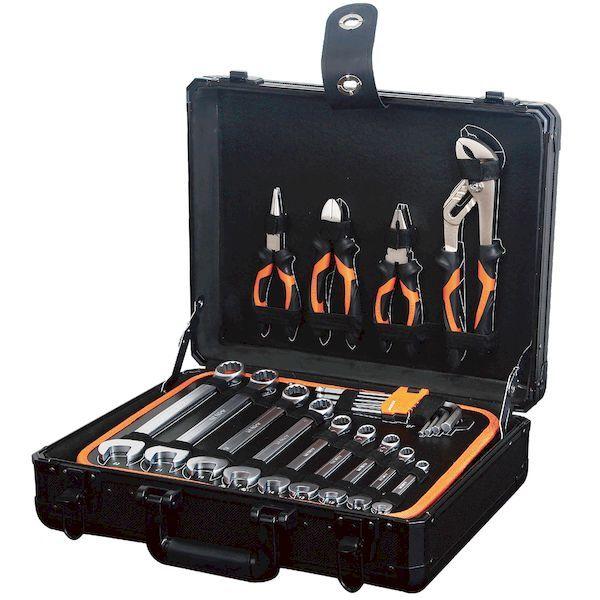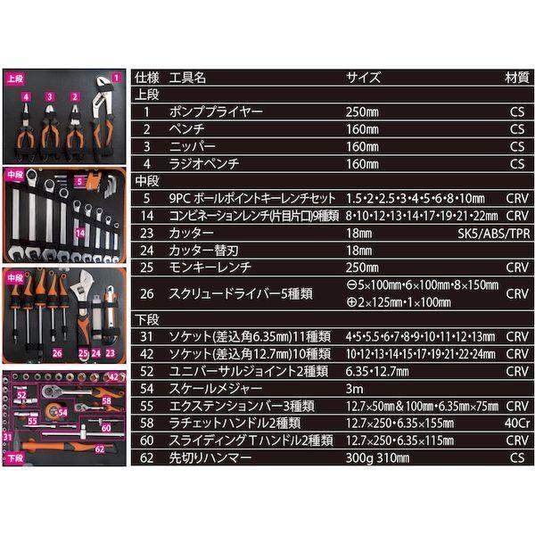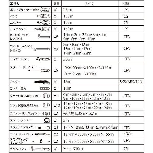【商品説明】●商品サイズ(mm):幅410×奥行340高さ135●重量(kg):8.8●セット内容:ポンププライヤー 250mm ペンチ 160mmニッパー 160mm ラジオペンチ 160mm●セット内容:ボールポイントキーレンチセット 1.5・2・2.5・3・4・5・6・8・10mm●セット内容:コンビネーションレンチ 8・10・12・13・14・17・19・21・22mm(片目片口)●セット内容:カッター 18mm カッター替え刃 18mm モンキーレンチ 250mm ●セット内容:スクリュードライバー(-)5×100・6×100・8×150(+)2×125・1×100mm●セット内容:ソケット(差込角6.35mm) 4・5・5.5・6・7・8・9・10・11・12・13mm●セット内容:ソケット(差込角12.7mm)10・12・13・14・15・17・19・21・22・24mm●セット内容:ユニバーサルジョイント 6.35・12.7mm スケールメジャー 3m 先切りハンマー 310mm●セット内容:ラチェットハンドル 12.7×250・6.35×155mm●セット内容:スライディングTハンドル 12.7×250・6.35×115mm●工具箱から工具まで、高品質にこだわった工具セットです。●プロユースにも耐えられるタフな工具セットです。●携帯し易いアタッシュケースで、持ち運び保管にも便利です。●DIYや自動車・バイクの整備用に。●出張整備に。●製造国:CN:中国●メーカー保証:6ヶ月●梱包サイズ(mm):幅440×奥行150×高さ350●梱包重量(kg):9●梱包方法:段ボール●発送口数:1