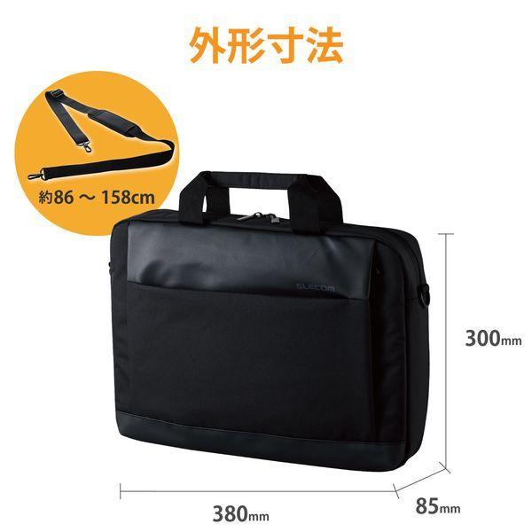 エレコムメーカーお問い合わせ:0120-898-794【商品説明】●メイン気室と前後ポケットに収納できる、整理タイプのキャリングバッグです。●パソコンや書類・小物なども持ち運べる十分な収納スペースを備えたブリーフケースタイプです。●前面ポケットには小物、背面ポケットには書類などを収納できます。●15.6インチまでのノートパソコンが収納可能なパソコン収納ポケットがついています。●表面生地にはフッ素コーティング撥水加工を施しています。※内部への水の浸入を完全に防ぐものではありません。●手提げだけでなく、付属のショルダーベルトで肩掛けも可能です。●背面にキャリーバーへ固定できるキャリーベルトを配置しています。